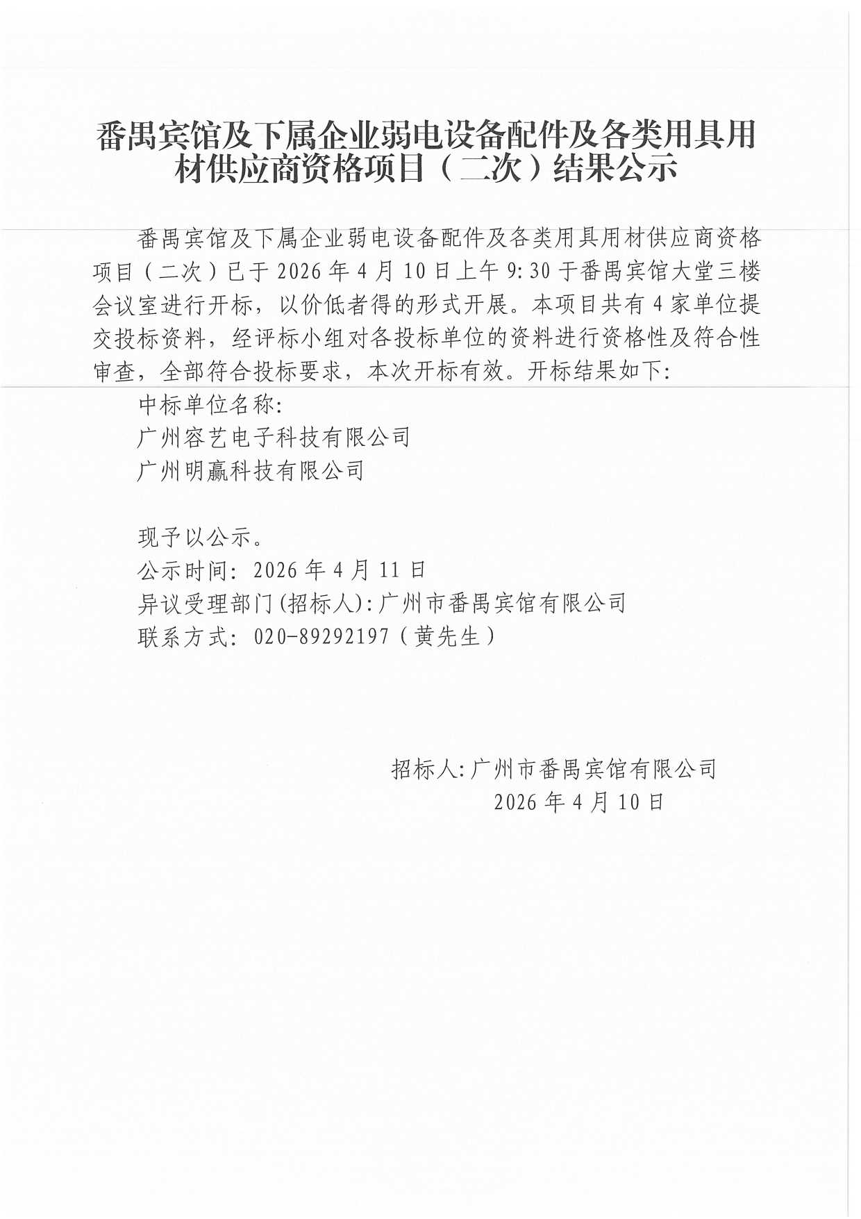番禺宾馆及下属企业弱电设备配件及各类用具用材供应商资格项目(二次)结果公示