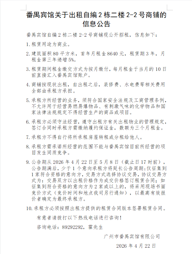 番禺宾馆关于出租自编2栋二楼2-2号商铺的信息公告