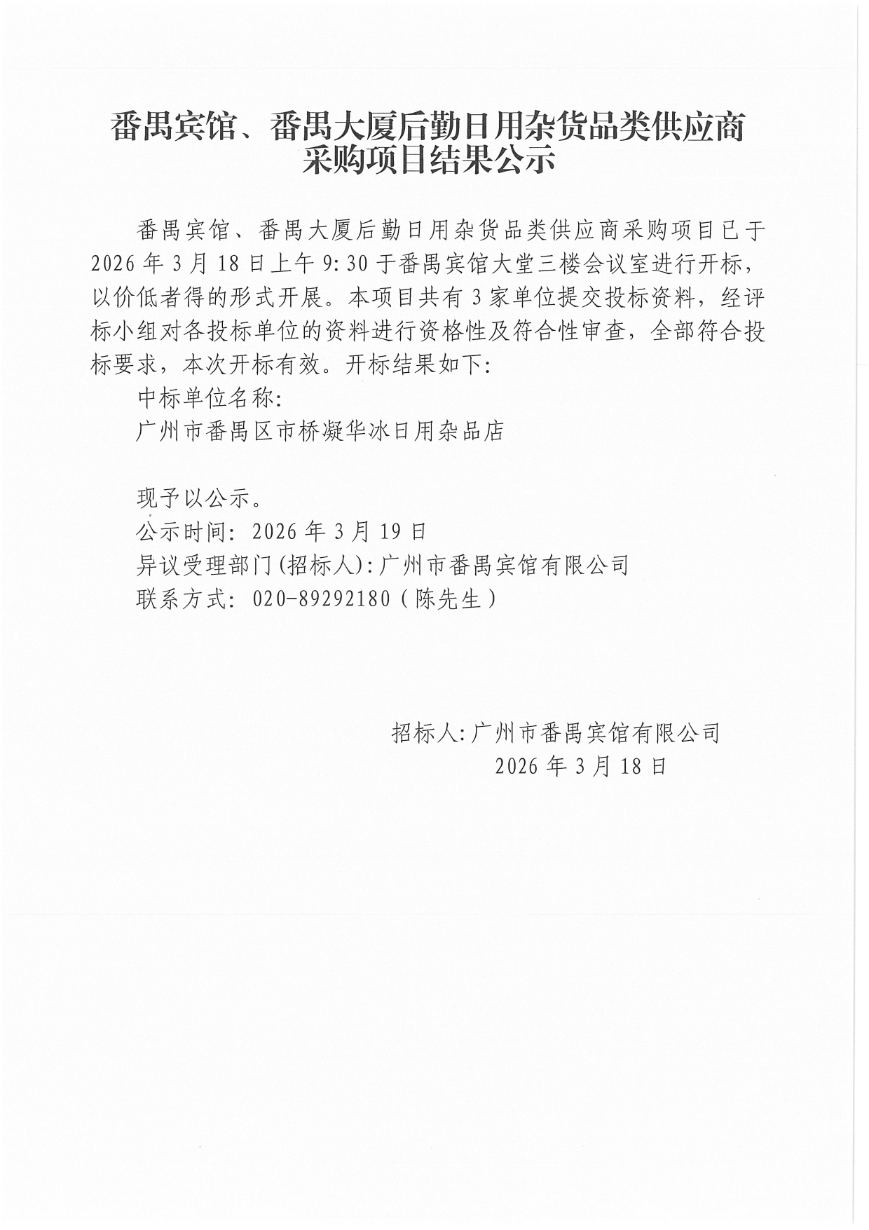番禺宾馆、番禺大厦后勤日用杂货品类供应商采购项目结果公示