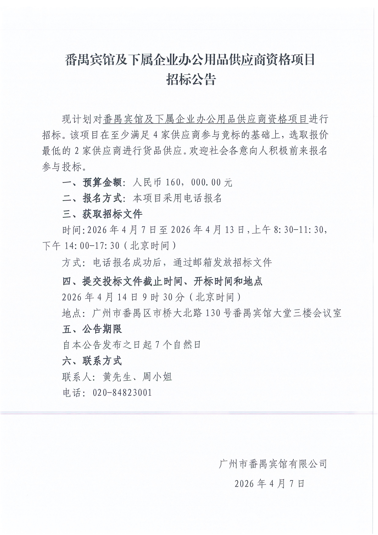 番禺宾馆及下属企业办公用品供应商资格项目招标公告